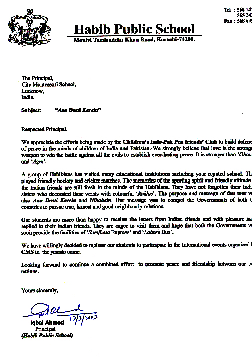 | Copy of the letter from Mr Iqbal Ahmed, Principal, Habib Public School, Karachi, Pakistan, received along with the letters of the school’s students |